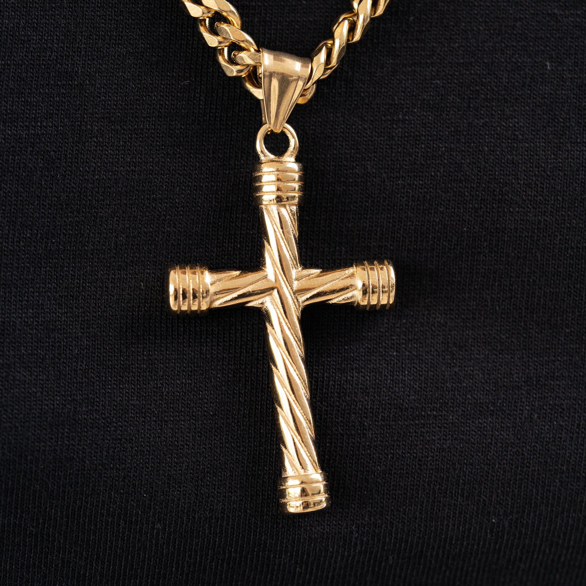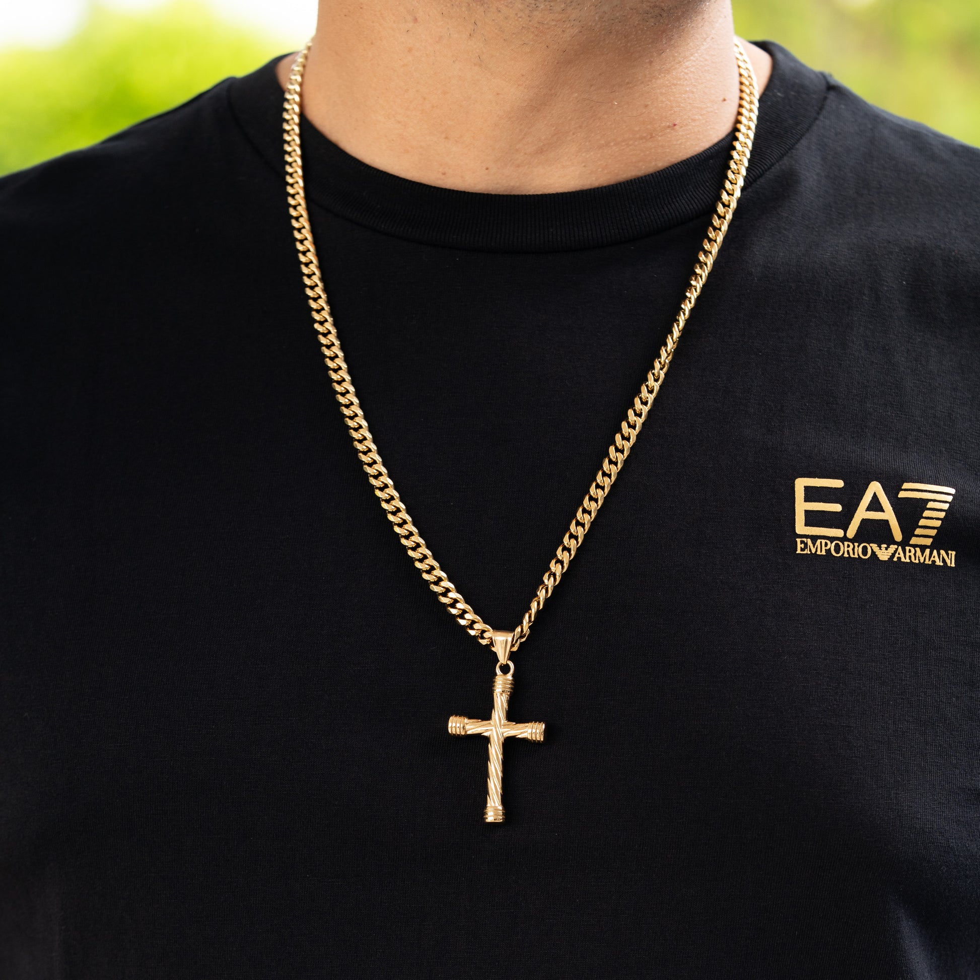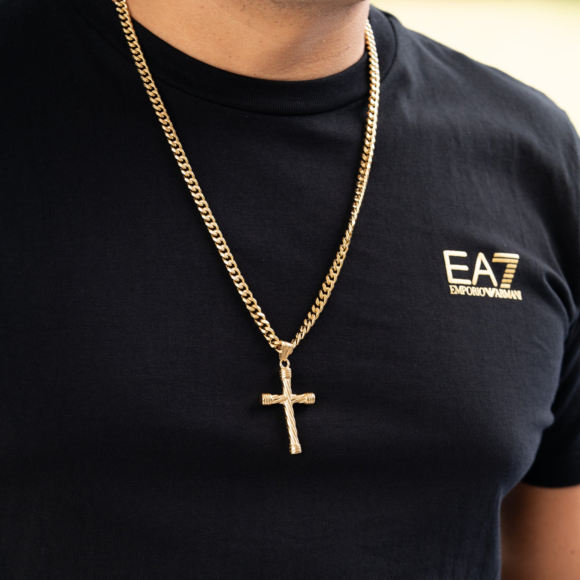 Cadena Tejido Cubana de Oro Laminado Italiano 18K. Incluye Dije Cruz Lazo, combina elegancia y durabilidad. Una pieza resistente que mantiene su belleza a lo largo del tiempo, ideal para realzar cualquier look. Todas nuestras joyas son contramarcadas en sus broches (por un lado el doble lingote que nos identifica y por el otro el 18K).