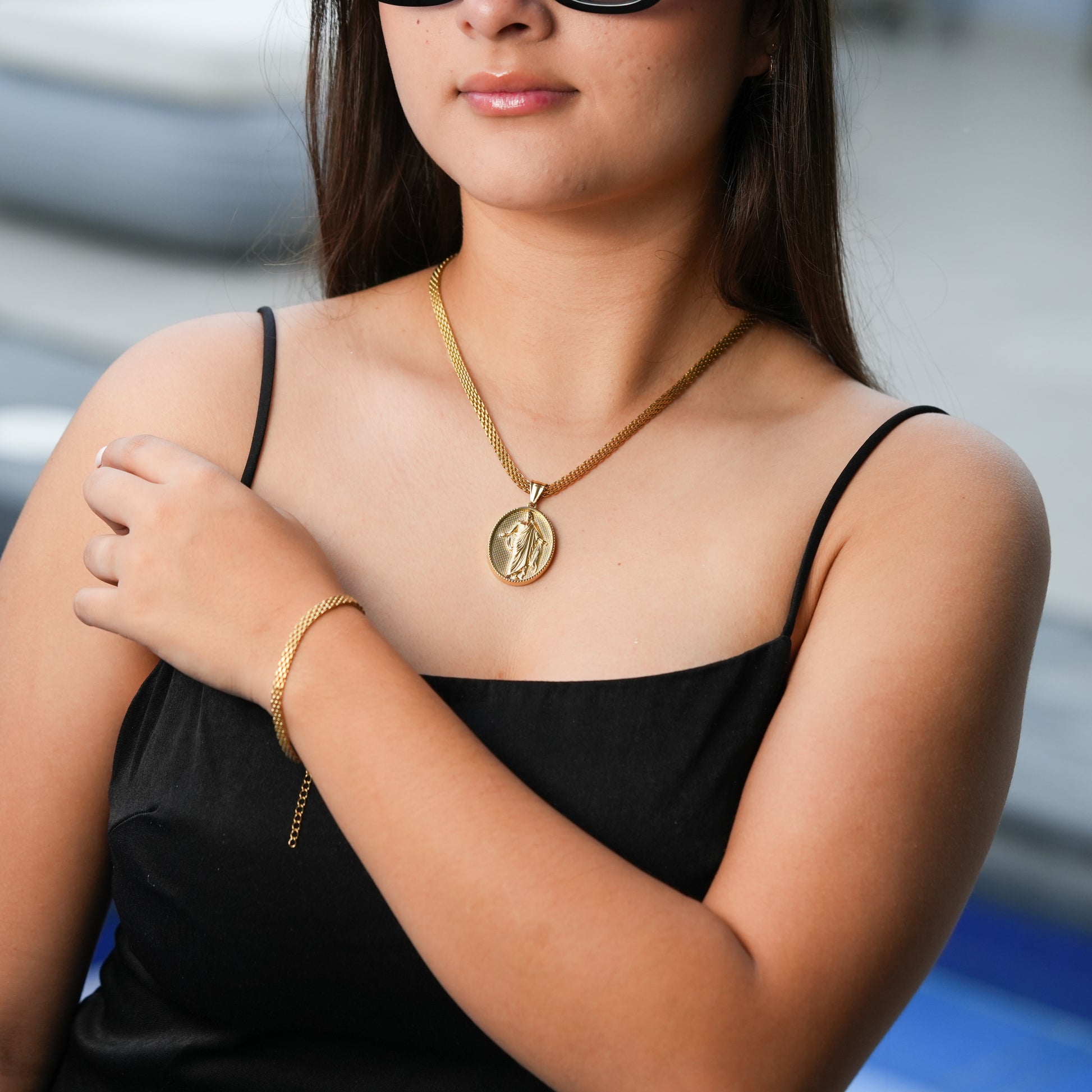 Combo para DAMA de Cadena y Pulsera Chinesca de Oro Laminado Italiano 18K con diseño clásico y acabado brillante. Incluye Dije Gratis. Combina elegancia y durabilidad. Una pieza resistente que mantiene su belleza a lo largo del tiempo, ideal para realzar cualquier look. Todas nuestras joyas son contramarcadas en sus broches (por un lado el doble lingote que nos identifica y por le otro el 18K).