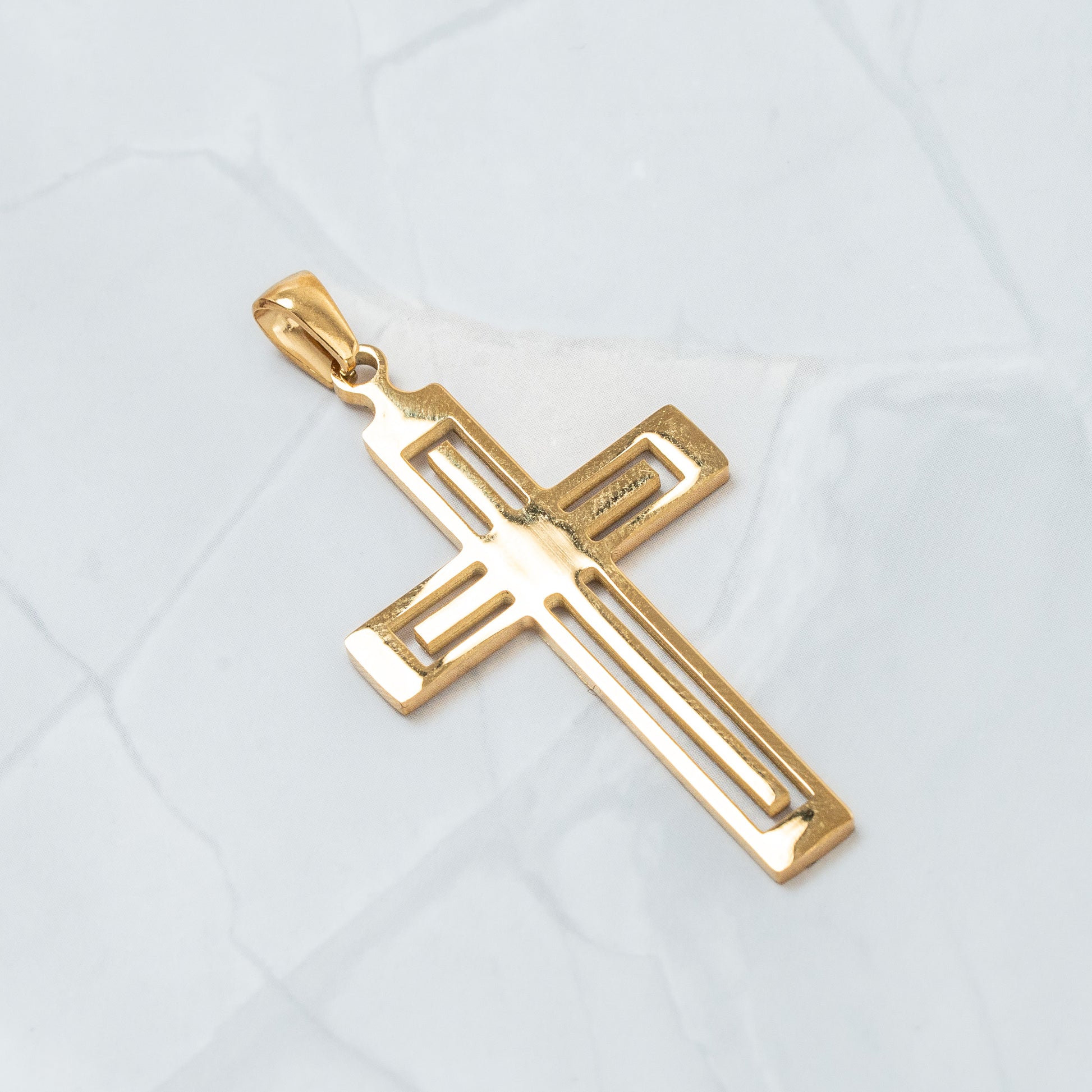 Dije Cruz ref 008 en Oro Laminado Italiano 18K con diseño en corona en sus puntas y acabado brillante. Combina elegancia y durabilidad. Una pieza resistente que mantiene su belleza a lo largo del tiempo, ideal para realzar cualquier look. Ideal para cadenas de hasta 6mm.