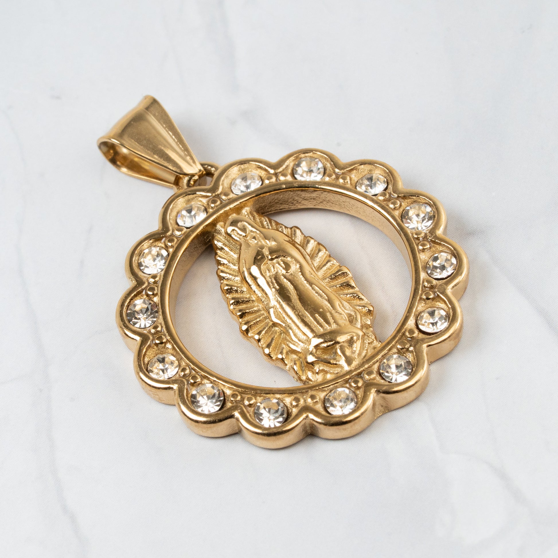 Dije Virgen Piedras en Oro Laminado Italiano 18K. Combina elegancia y durabilidad. Una pieza resistente que mantiene su belleza a lo largo del tiempo, ideal para realzar cualquier look. Ideal para cadenas de hasta 6mm.