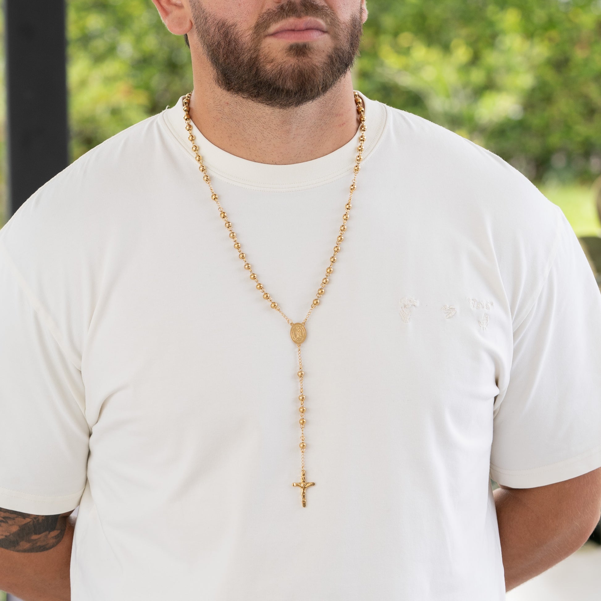 Rosario balín # 6 en Oro Laminado Italiano 18K con diseño clásico y acabado brillante. Perfecta para usar sola o con otros accesorios, combina elegancia y durabilidad. Una pieza resistente que mantiene su belleza a lo largo del tiempo, ideal para realzar cualquier look. Todas nuestras joyas son contramarcadas en sus broches (por un lado el doble lingote que nos identifica y por le otro el 18K).